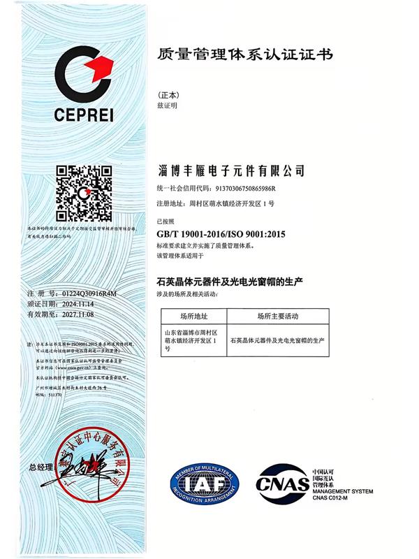 淄博豐雁電子元件有限公司,是一家集研發、生產、銷售為一體的透鏡管帽、晶體諧振器、晶體濾波器的高新技術企業。成立于1992年,坐落于山東省淄博市周村區,注冊資金1000萬元,擁有職工150余人,公司占地35000平方米,其中擁有5000平方的超凈化廠房,并配備了千級凈化工作臺,確保環境的凈化度。公司下設光電事業部,濾波器事業部,晶體事業部等多個事業部。專注為光通訊、激光器領域以及各種電子應用領域進行電子元件配套。公司于1999年通過了ISO9000質量體系認證,公司提供的所有產品符合歐盟的R0HS和REACH標準。公司擁有持續創新的研發團隊,有常年的外聘技術專家長期指導,并且與國內多所大學和光電研究所保持長期合作關系,確保了產品和技術的先進性,能持續為客戶提供高質量的產品和更好的全方位服務。
